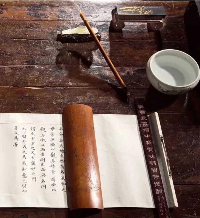 该器具在唐代邮驿系统中成为诗歌运输载体,收件人可反复存取筒内诗卷。北宋时期竹书筒扩展至存放诗文草稿及谏官奏章。明清诗筒形制趋于规范,褚松窗《竹刻脞语》记载其圆径一寸、高三寸余,置于案头存放零星诗稿,《敬业堂诗集》描述为“截竹为筒,粉筠外莹”。高濂《遵生八笺》将其列为出游携带的文房雅具,《红楼梦》提及元春赐予宫制诗筒用于暂存诗稿 。