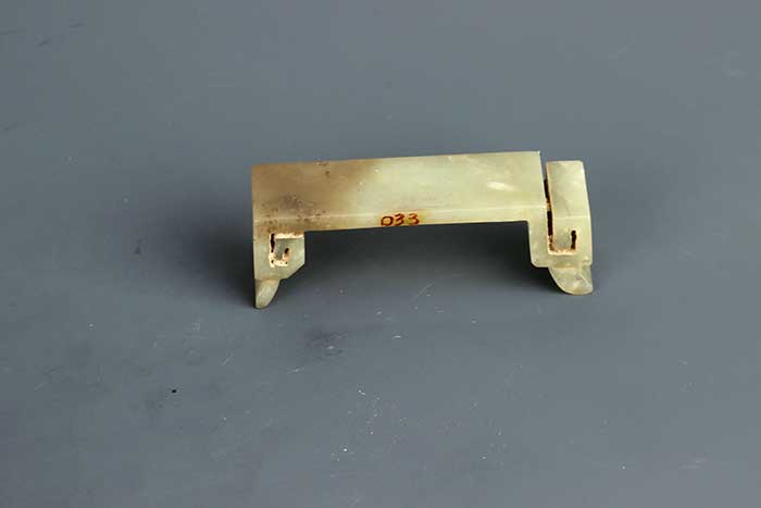 通长8.0厘米、通宽2.2厘米、通高2.4厘米。“几”形墨玉床,两端为回字形,一端上翻,一端内卷。墨床主要用于承托研磨后湿润的墨锭,避免玷污他物。在清代文房雅玩鼎盛时期,它从单纯的实用器具发展为兼具观赏与收藏价值的艺术品,体现了当时高超的玉器雕琢工艺和文人的审美追求,是研究清代文房文化与玉器工艺的重要实物资料。