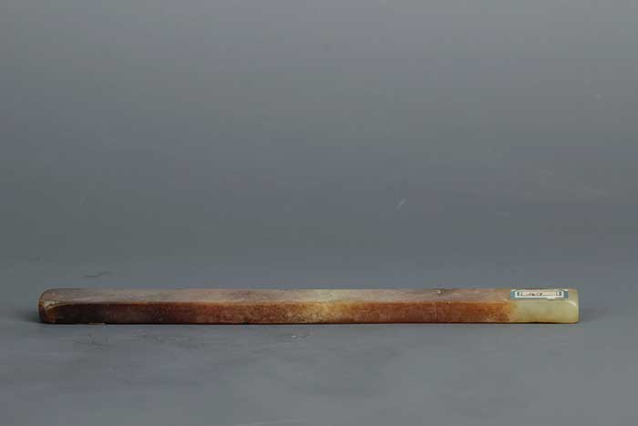 通长23.1厘米、通宽2.4厘米、厚0.9厘米。器呈长方形条,写字作画时用以压纸,也称镇尺、压尺。清代玉镇纸是文房用具中的精品,以其温润的玉质、精湛的工艺和深厚的文化内涵,成为清代文房雅玩的典型代表。
