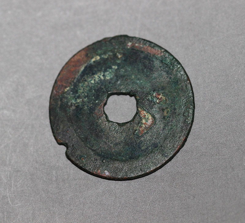 直径2.5厘米、穿边长0.7厘米、厚0.12厘米。北宋真宗赵恒天禧年间(公元1017年~公元1021年)铸造,圆形方穿、正面铸文“天禧通宝”。1992年被鉴定为一般文物