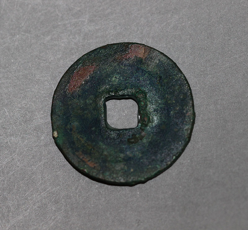 直径2.厘米5、穿边长0.7厘米、厚0.12厘米。北宋真宗赵恒天禧年间(公元1017年~公元1021年)铸造,圆形方穿、正面铸文“天禧通宝”。1992年被鉴定为一般文物。