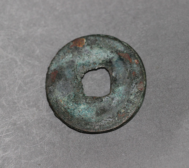 直径2.4厘米、穿边长0.7厘米、厚0.1厘米。北宋徽宗赵佶建中靖国元年(公元1101年)铸造,圆形方穿、正面铸文“圣宋元宝”。1992年被鉴定为一般文物。