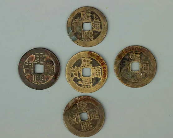 直径2.5厘,内口径0.3厘米。铸造于清圣祖康熙年间(1662-1722年),是清代流通量极大的钱币之一。钱币呈圆形小方孔形制,正反两面均内凹,正面以楷书书写“康熙通宝”四字,字体端庄规整;背面印有汉字“临、宣、河”及满文款识,“临”“宣”“河”分别代表山东临清、直隶宣化、河南开封等地的铸币局,体现了清代前期“各省铸币、中央管控”的铸币体系,也反映了康熙时期全国经济的恢复与发展。