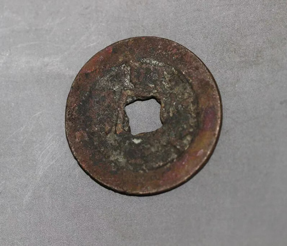 直径3.3厘米,穿边长0.5厘米。钱币体量较大,质地厚重。其为圆形小方孔形制,正反两面均呈内凹状,正面以隶书书写“崇宁重宝”四字,字体雄浑大气,笔画饱满有力。此币铸造于北宋末年宋徽宗崇宁年间(1102-1106年),彼时北宋国力虽渐衰,但铸币工艺仍保持较高水平,钱文清晰规整,是宋代年号钱的典型代表。