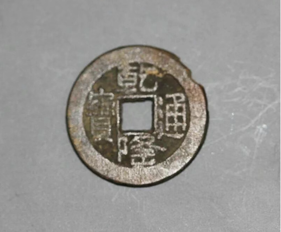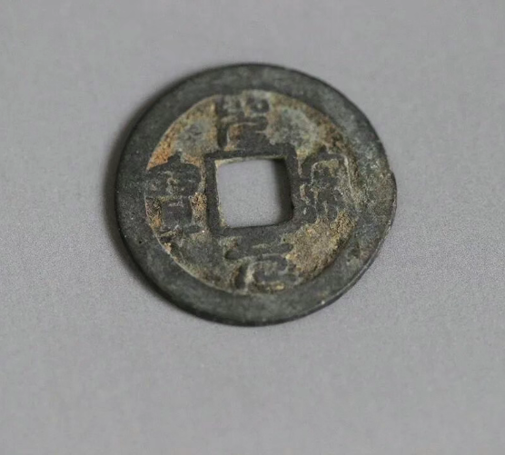 直径2.2厘米,穿边长0.4厘米。钱币小巧精致,通体呈青灰色。其为圆形方穿形制,铸造于北宋徽宗建中靖国元年(公元1101年),是宋徽宗即位后铸造的首个年号钱。正面铸文“圣宋通宝”,字体为篆书,笔法圆润流畅,结构严谨对称,展现了宋代篆书书法的艺术魅力,因铸造时间短、存世量较少,具有较高的收藏与研究价值。