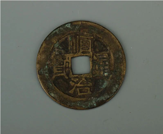 直径2.6厘米,穿边长0.4厘米。铸造于清世祖顺治年间(1644-1661年),是清代入关后最早铸造的钱币之一,承载着确立清代货币体系的历史使命。钱币呈圆形小方孔形制,正反两面内凹,正面以楷书书写“顺治通宝”四字,字体刚劲有力,兼具明代钱币风格与清代特色;背面印有汉字“原”及满文款识,“原”字表明其铸造于太原铸币局,是清代早期“满汉合文”钱式的典型代表,反映了满汉文化融合与中央对地方铸币的管控。