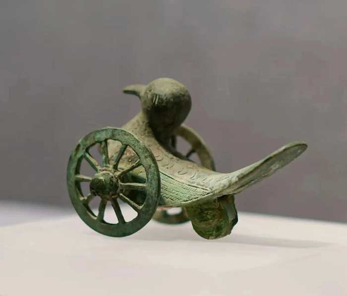 三轮铜鸠车是晋代传统玩具,整体呈斑鸠造型,长13厘米、高6厘米,采用双翅与尾部共设三轴的机械结构。该器物通过胸前圆环系绳牵引实现滑动功能,印证了《幽求子》"五岁有鸠车之乐"的文献记载。