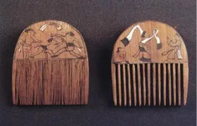 1975年出土于湖北江陵凤凰山秦墓。该文物由木梳和木篦组成,材质为木质,表面施以漆绘工艺。木梳与木篦上部均呈弧形,正反两面采用黑漆勾线勾勒轮廓,并以红、黄等色进行敷彩装饰。木梳正面图案描绘四人宴饮场景,左部男子头戴冠,右部男子头挽髻,中间侍女手持酒杯与盛食器。反面呈现舞女起舞场景,左侧有歌女伴唱,右侧男子奏乐。木篦正面描绘男女执手送别画面,两侧有持械武士,反面展现三人角抵竞技场面。
